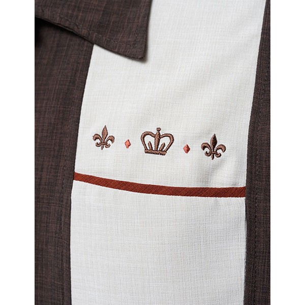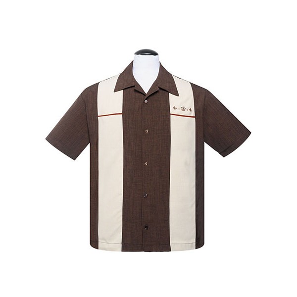 Classic 1950s Rockabilly bowling style shirt in brown with embroidered motif, vintage styling by Steady Clothing made in the USA.