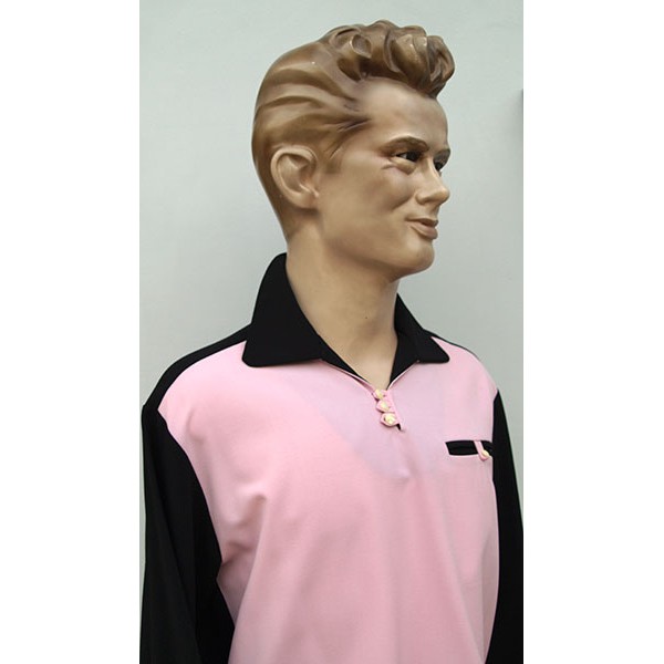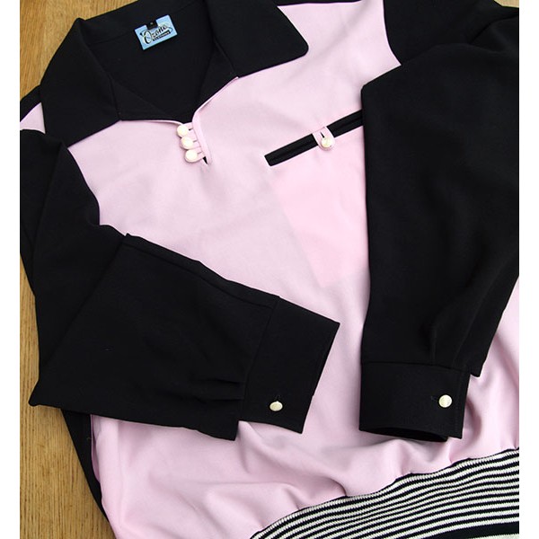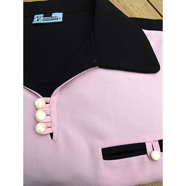 High quality 1950s Rockabilly style Gaucho shirt in black with pink front panel, killer vintage reproduction design by Ozone Clothing made in the UK .