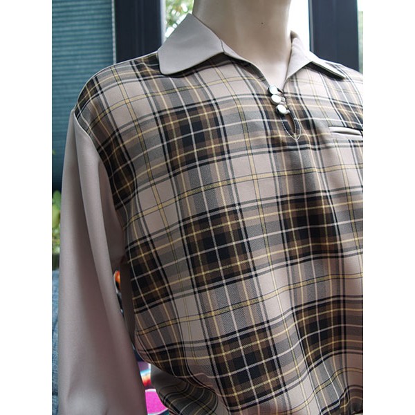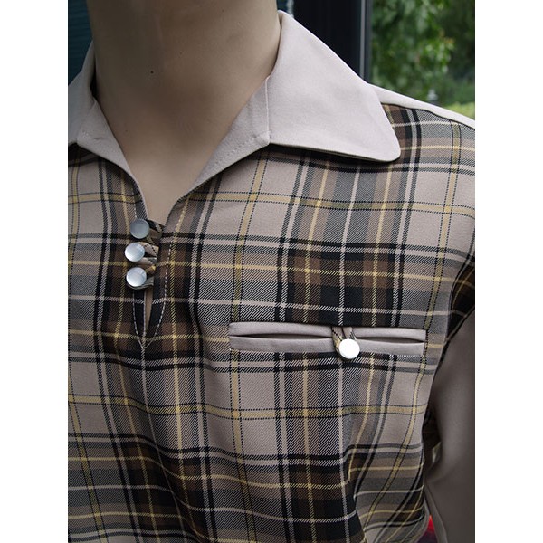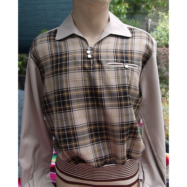 High quality 1950s Rockabilly style Gaucho shirt in beige with brown plaid front panel, killer vintage reproduction design by Ozone Clothing made in the UK .