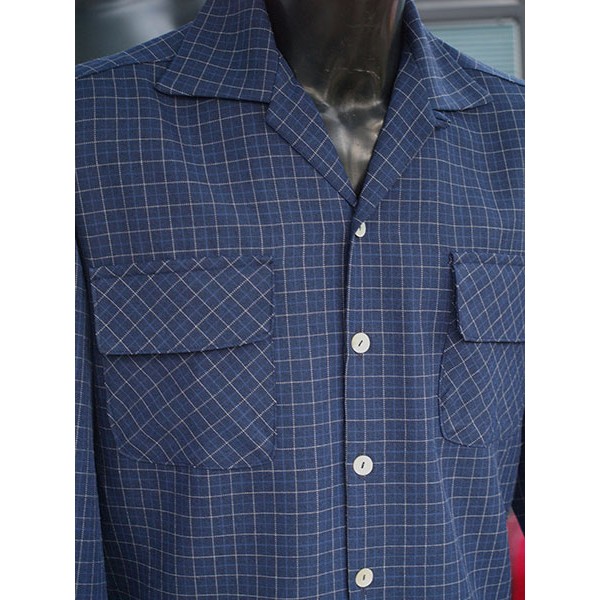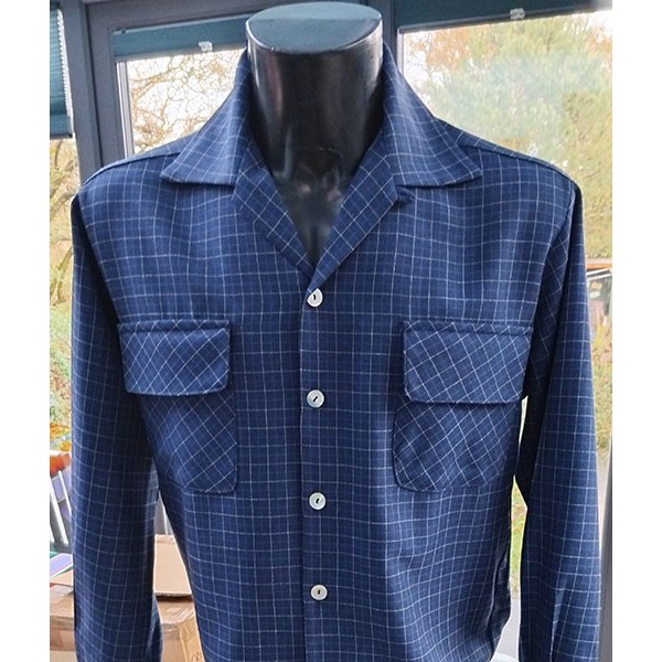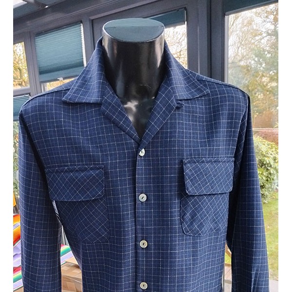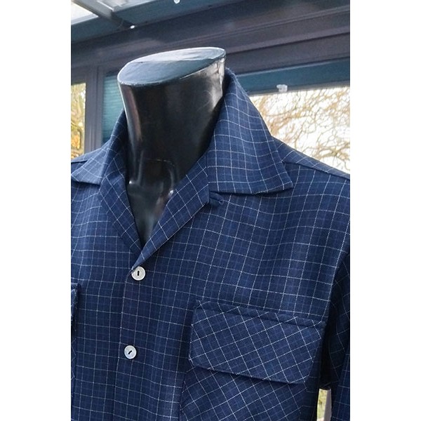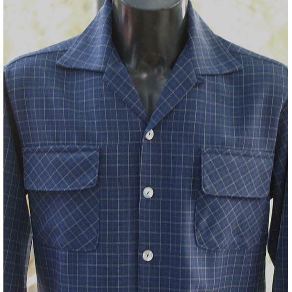 Classic 1950s rockabilly gab style shirt in quality in blue check fabric, with loop collar, double flap pocket frontage and pleated back, manufactured in the UK by Ozone Clothing.
