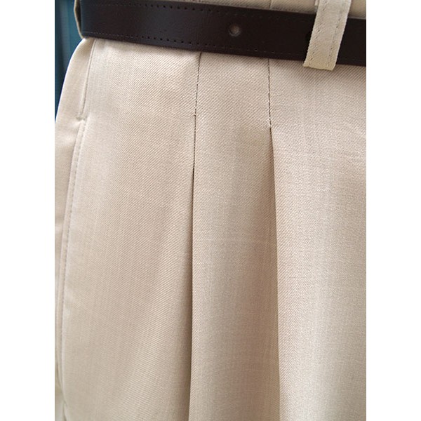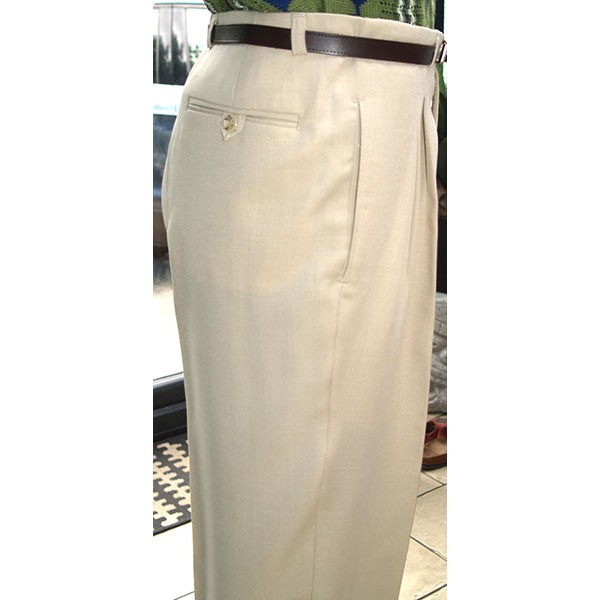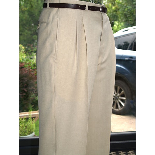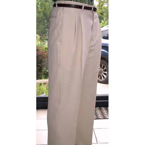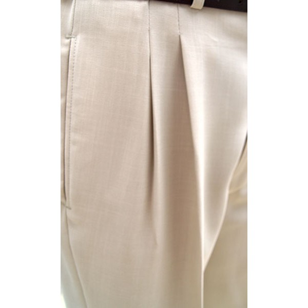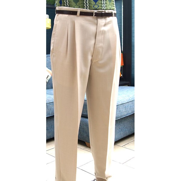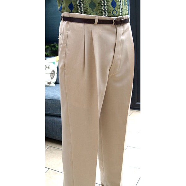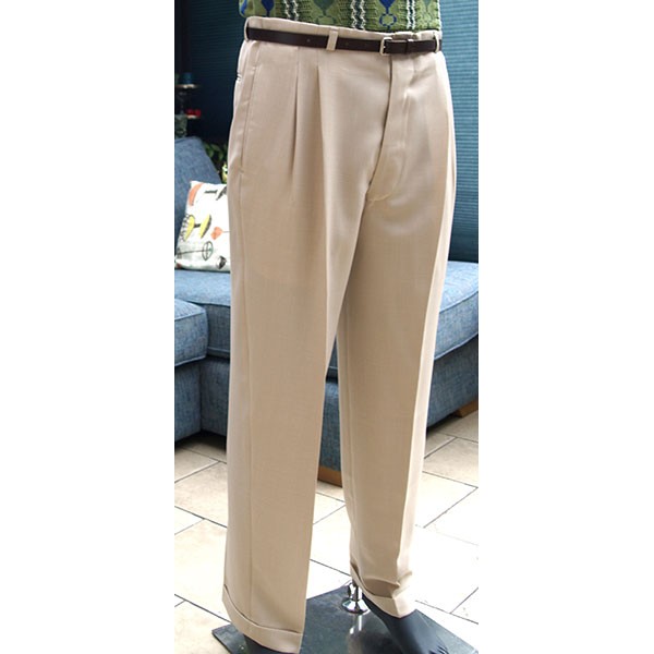 Top quality high waisted 1950s Rockabilly style pegs in pale soft cream with double pleat and cuffed 20" bottoms, tailor made in the UK by Ozone Clothing.