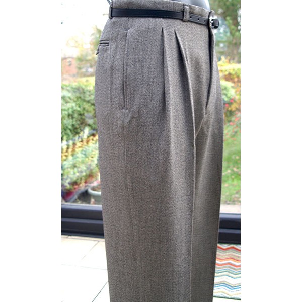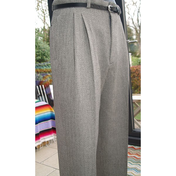 High quality tailor made 1950s Rockabilly style high waisted pegs in an oatmeal speckled cloth, a exact reproduction of a an American vintage pair, manufactured in the UK for ozone clothing.