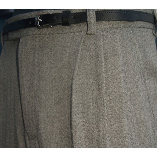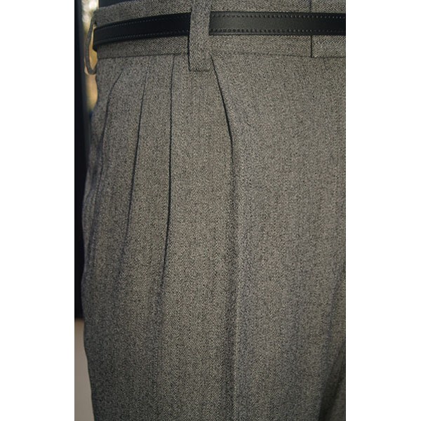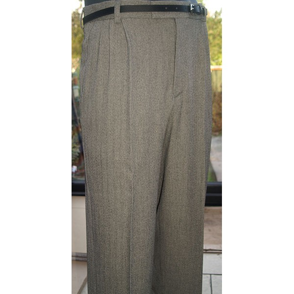 Classic 1950s vintage peg style trousers in oatmeal speck with triple pleats and 20" bottoms with turn up, outstanding tailoring manufactured in the UK for Ozone Clothing .